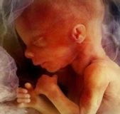 The fetus is now about five inches long. The child blinks, grasps, and moves her mouth. Hair grows on the head and body. The ears are now functioning and the baby can hear his mother's voice. By the end of the 4th month, the fetus weighs a half pound or more and is eight to ten inches in length.